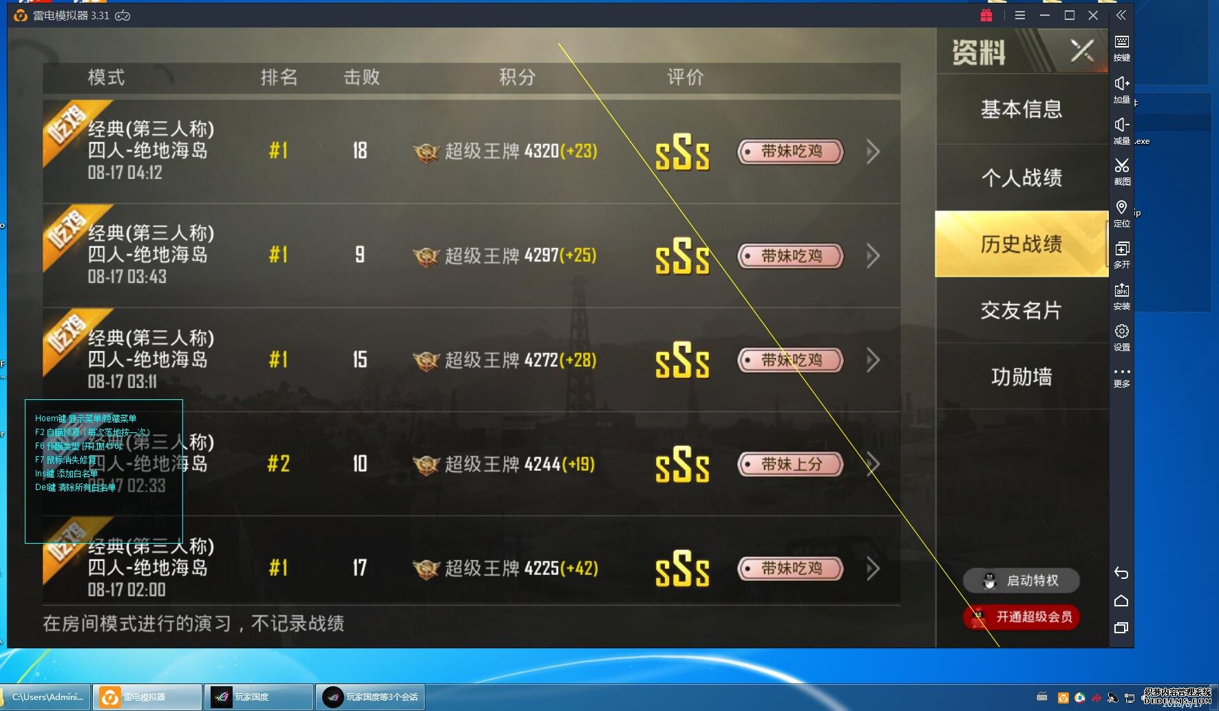 支持雷电、蓝叠、腾讯助手、可以过检测匹配到手机玩家。基本不存在封号。