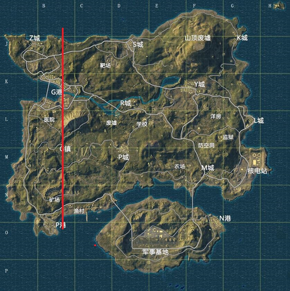 接下来是左侧航线,左侧航线最大的特点就是“上肥下穷”,所以在战术思路上就可以简单的分为刚和苟,想刚?G港/学校/医院随便选。想苟?P港/矿场/渔村任你挑。除了这个显而易见的分配以外,我们还可以选择热门点位的野区附近进行降落,比如医院西南方向的野区,也能够获得不错的发育。